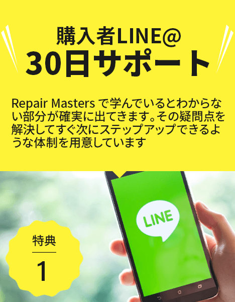 「Repair Masters」では全く知識のない超初心者の方でも、本業が忙しく少しの時間しかない方でも、全員が短期間で身に付くような手法を詰め込んでいます
